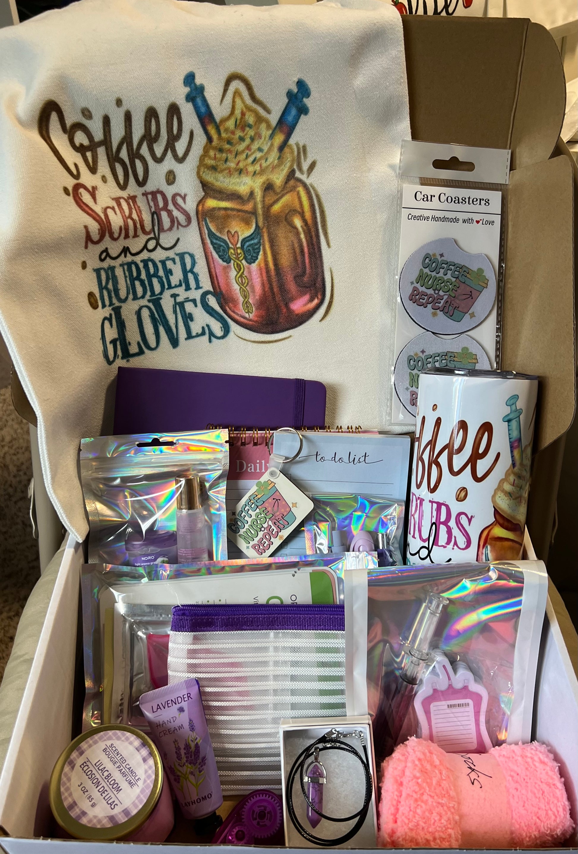 Nursing gift boxes includes 17 items---Tote, 20oz tumbler, 2pk car coasters, 3 pk pen set, journal, daily planner, to do list note pad, syringe pen with small IV bag note pad, hand cream, fuzzy socks, crystal necklace, mesh pencil bag, candle, keychain, correction tape, 2pk lip balm, face, eye and lip masks plus some freebies.
