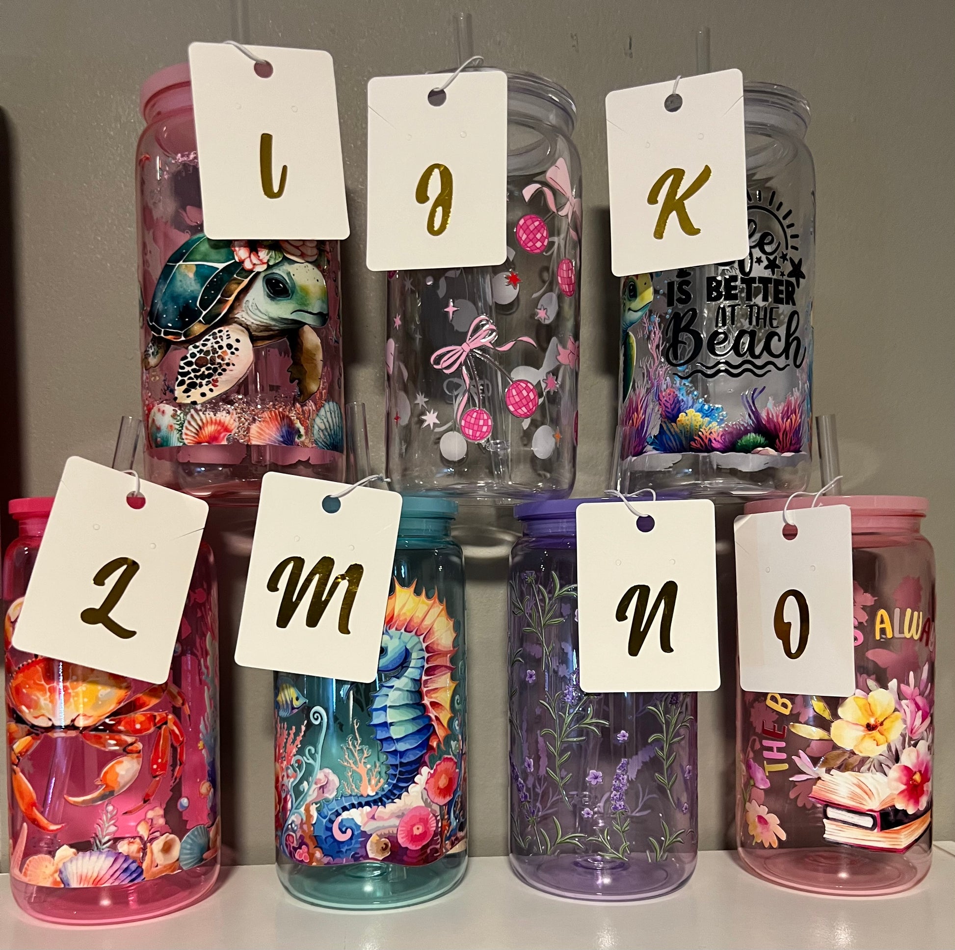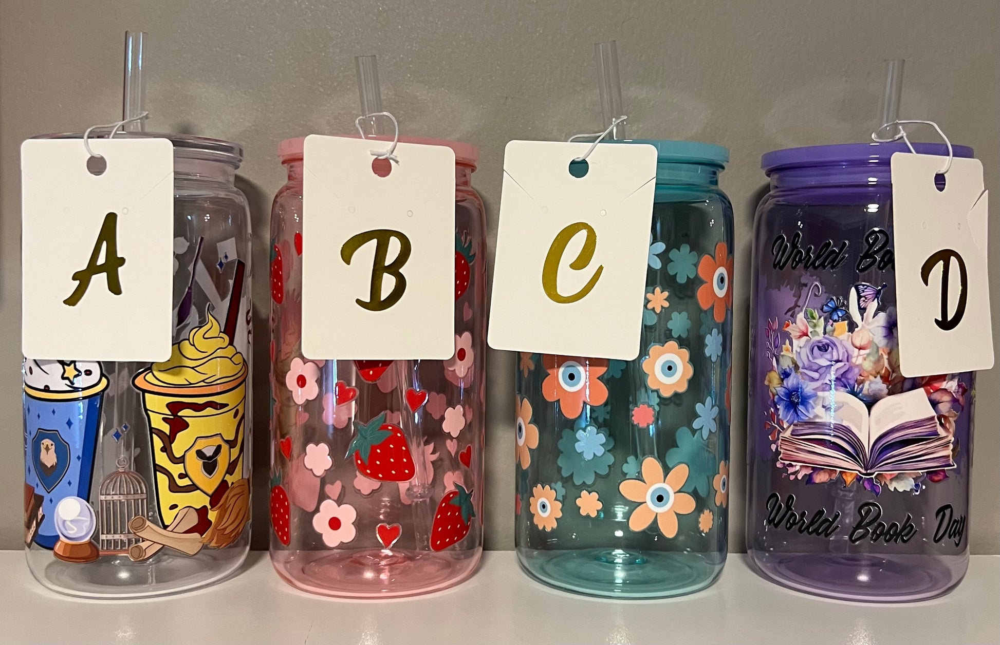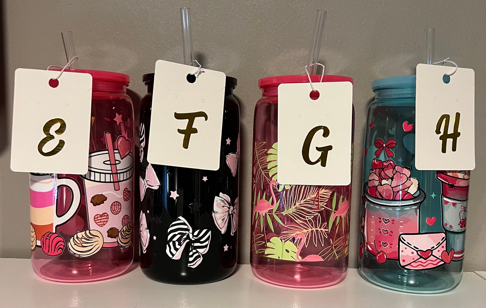 16oz tumblers, we have 15 different designs to choose from. Comes with a straw, straw cleaning brush and care instructions, comes in a special holographic box with a ribbon. Designs are lettered so it's easier to know which one is being ordered, designs also get switched out every month. If you have a design in mind or would like one that is no longer visible, just send us an email.